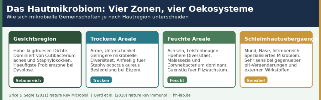 Das Hautmikrobiom ist keine einheitliche Gemeinschaft — es ist ein Mosaik aus hochspezifischen mikrobiellen Ökosystemen, die von Körperregion zu Körperregion stark variieren. Grice & Segre (2011) charakterisierten in ihrer bahnbrechenden Arbeit in Nature Reviews Microbiology die Diversität des kutanen Mikrobioms und zeigten, dass sebumreiche, feuchte und trockene Hautareale fundamental unterschiedliche mikrobielle Populationen beherbergen.[1]