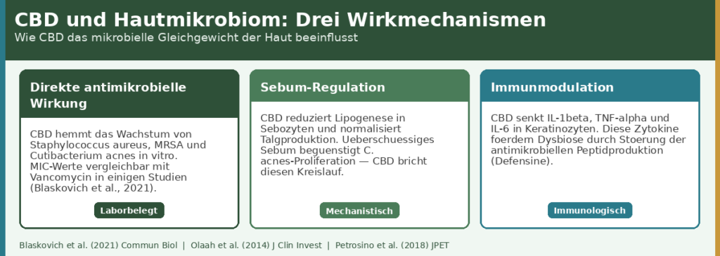 Entzündung und Dysbiose verstärken sich gegenseitig: Pro-inflammatorische Zytokine wie IL-1β und TNF-α hemmen die Produktion antimikrobieller Peptide (Defensine, Cathelicidine) in Keratinozyten — jenen Immunmolekülen, die das natürliche Mikrobiogleichgewicht der Haut aufrechterhalten. Weniger Defensine bedeuten weniger Schutz gegen Pathogene wie S. aureus. Mehr Pathogene bedeuten mehr Entzündung. CBD unterbricht diesen Kreislauf an zwei Stellen: durch direkte Zytokinhemmung und durch antimikrobielle Wirkung gegen die pathogenen Akteure selbst.