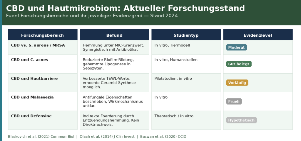1. CBD hat antimikrobielle Wirkung gegen grampositive Hautpathogene. Belegt in vitro für S. aureus, MRSA und C. acnes. Klinische Humanstudien ausstehend.