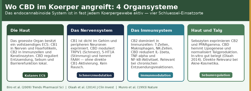 Die Haut ist das größte Organ des menschlichen Körpers — und besitzt ein vollständiges, autonomes endocannabinoides System. Bíró et al. (2009) beschrieben das kutane ECS als eigenständiges Regulationssystem mit CB1-Rezeptoren in sensorischen Neuronen und Haarfollikeln, CB2-Rezeptoren in Immunzellen und Keratinozyten sowie den Abbauenzymen FAAH und MAGL.[1]