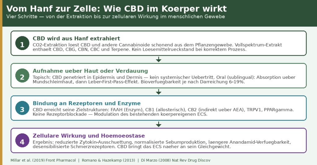 Du hast von CBD gehört. Du weißt, dass es aus der Hanfpflanze stammt und dass es nicht berauscht. Aber was passiert eigentlich, wenn CBD auf deinen Körper trifft? Warum wirkt es auf die Haut? Warum soll es Schmerzen lindern können? Und warum braucht es Wochen, bis man etwas merkt? Dieser Artikel beantwortet genau diese Fragen — auf einem Niveau, das keine Biochemie-Vorlesung voraussetzt, aber die Wissenschaft trotzdem respektiert.