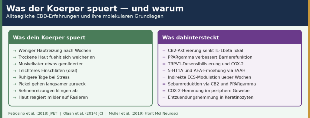 Die Gegenüberstellung zeigt eine wichtige Eigenschaft des ECS: Es reguliert nichts mit starker Hand. Wenn du nach mehreren Wochen konsistenter topischer CBD-Anwendung eine ruhigere Hautreaktion nach dem Rasieren bemerkst, liegt das an einer CB2-vermittelten Reduktion der Entzündungsantwort in Keratinozyten — nicht an einem dramatischen Eingriff. Die Molekularbiologie ist präzise; die subjektive Erfahrung ist subtil.