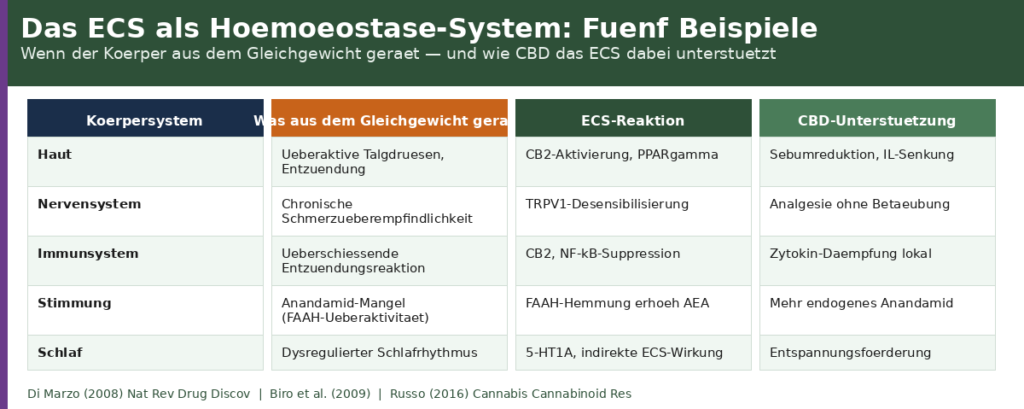 - Das Ziel ist Homöostase. CBD hilft dem ECS, Gleichgewicht herzustellen — nicht neue Prozesse einzuschalten.