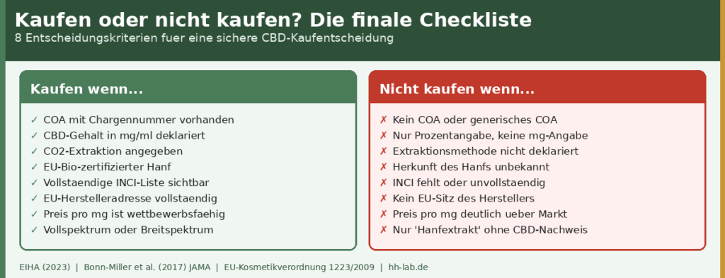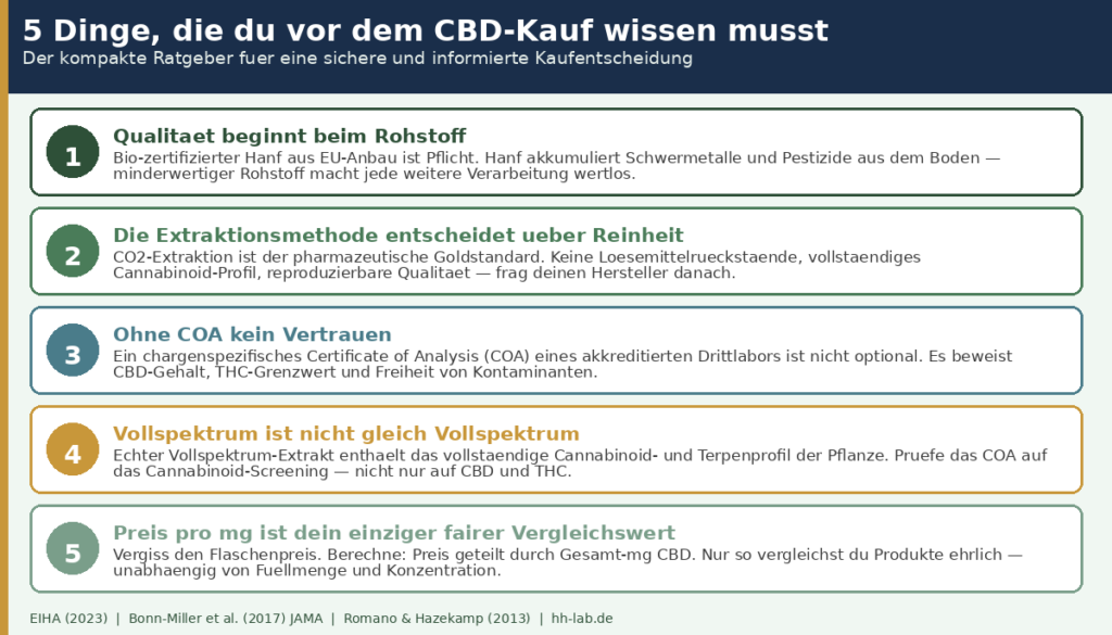 Der CBD-Markt belohnt informierte Käufer. Die fünf Dinge, die wir in diesem Artikel besprochen haben — Rohstoffqualität, Extraktionsmethode, COA-Validität, Extrakt-Typ und echter Preis pro mg — sind keine anspruchsvollen Insiderkenntnisse. Sie sind grundlegende Verbraucherschutzinstrumente, die jeder in wenigen Minuten anwenden kann.