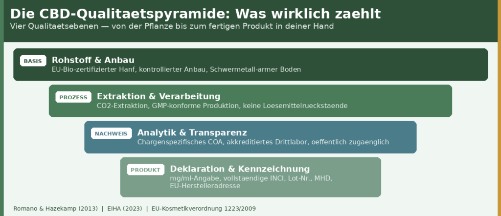 CBD Qualitätspyramide: Vier Ebenen von Rohstoff und Anbau bis zur Produktkennzeichnung