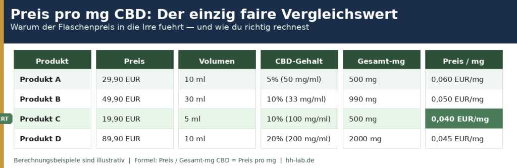 Dieser Wert — Euro pro Milligramm CBD — ist der einzige Vergleichswert, der unabhängig von Flaschengröße, Konzentration und Verpackung funktioniert. Ein guter Marktpreis für hochqualitatives Vollspektrum-CBD liegt typischerweise zwischen 0,03 und 0,08 EUR/mg, je nach Extraktqualität und Laborkosten.
