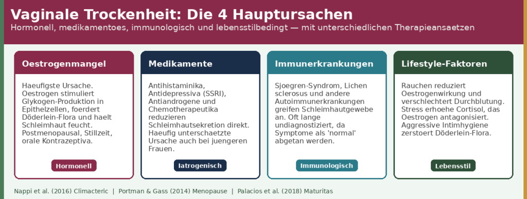 Das Sjögren-Syndrom — eine Autoimmunerkrankung, die exokrine Drüsen angreift — führt zu systemischer Trockenheit, einschließlich der Vaginalschleimhaut. Lichen sclerosus ist eine weitere Autoimmunerkrankung mit direktem Befall des Vulva-Gewebes, die zu Atrophie, Trockenheit und Schrumpfung führt. Beide Erkrankungen werden oft erst nach Jahren diagnostiziert.
