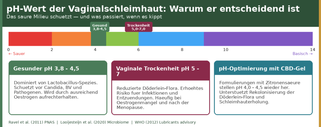 💡 Praktische Konsequenz: Topische Produkte für den Intimbereich sollten pH-kompatibel formuliert sein — idealerweise zwischen 4,0 und 4,5. Produkte mit höherem pH (auch „neutrale” Gleitmittel) können die Döderlein-Flora zusätzlich beeinträchtigen. Prüfe die pH-Angabe auf der Produktverpackung oder frage den Hersteller.
