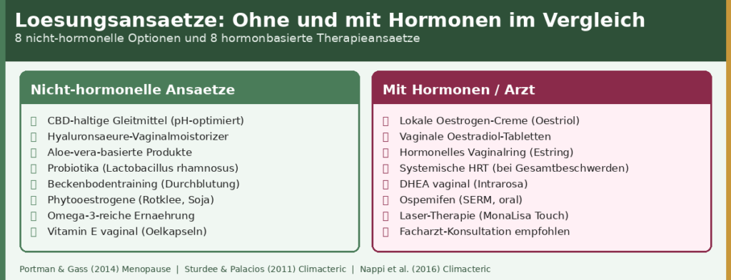 - Nicht-hormonelle Optionen realistisch einschätzen. Hyaluronsäure, Probiotika und CBD können bei milden Symptomen effektiv sein — bei schwerem GSM sind Hormone oft nötig.
