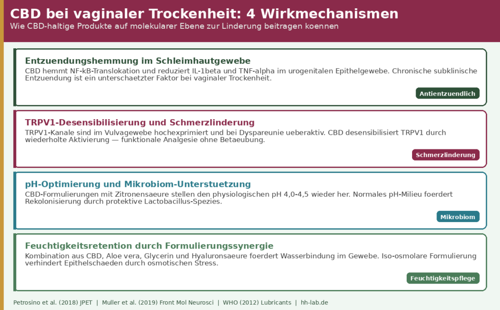Die wissenschaftliche Grundlage wurde in diesem Blog bereits ausführlich beschrieben: Das endocannabinoide System ist im Urogenitaltrakt aktiv, CB2-Rezeptoren und TRPV1-Kanäle sind in der Vaginalschleimhaut nachgewiesen, und CBD moduliert beide Systeme mit entzündungshemmenden und schmerzlindernden Effekten. Was bei vaginaler Trockenheit besonders relevant ist: